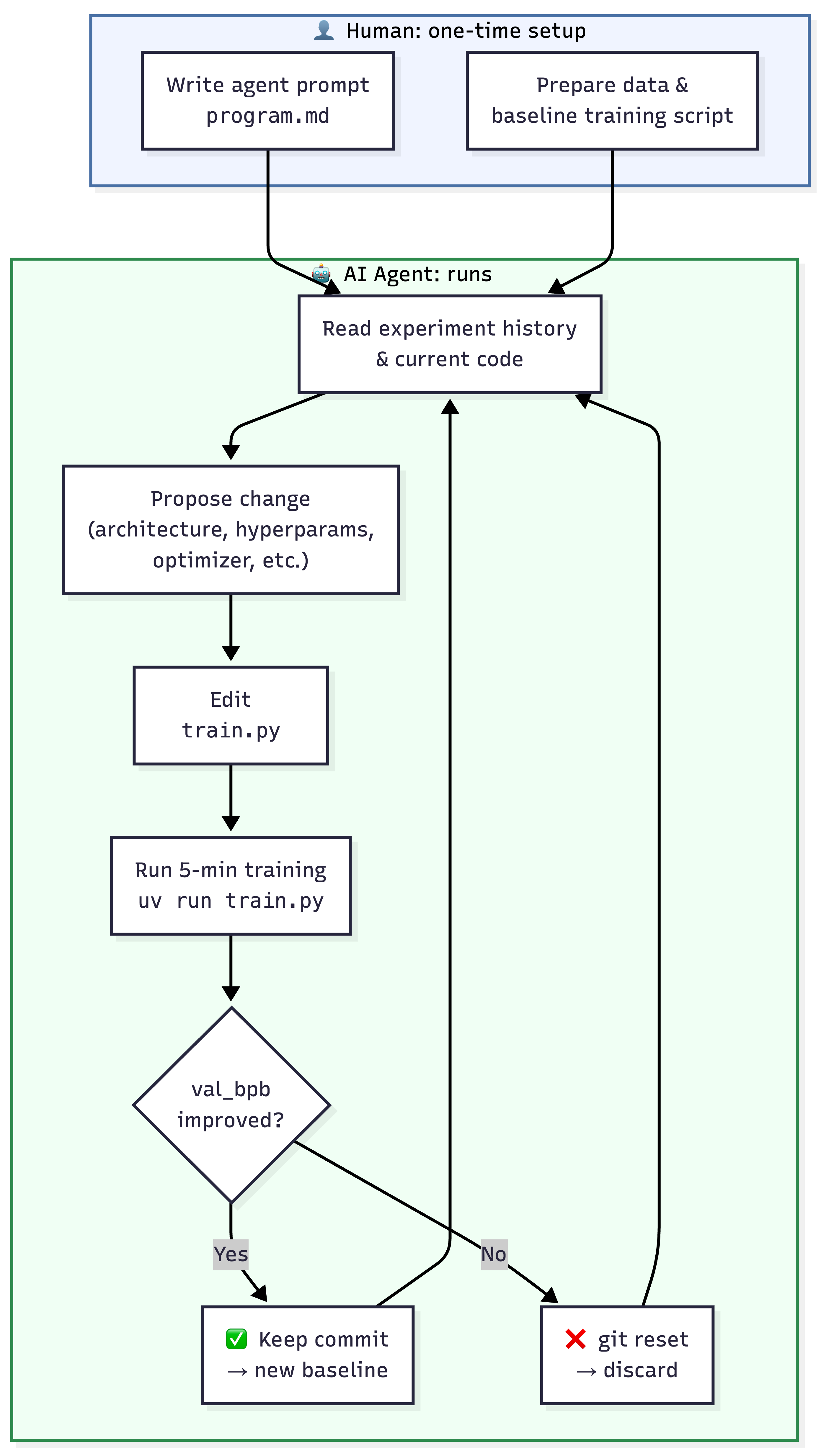 train.pyonly. Data prep and evaluation are locked down. - Git as memory. Each experiment is a commit. The agent reads branch history to plan what to try next.