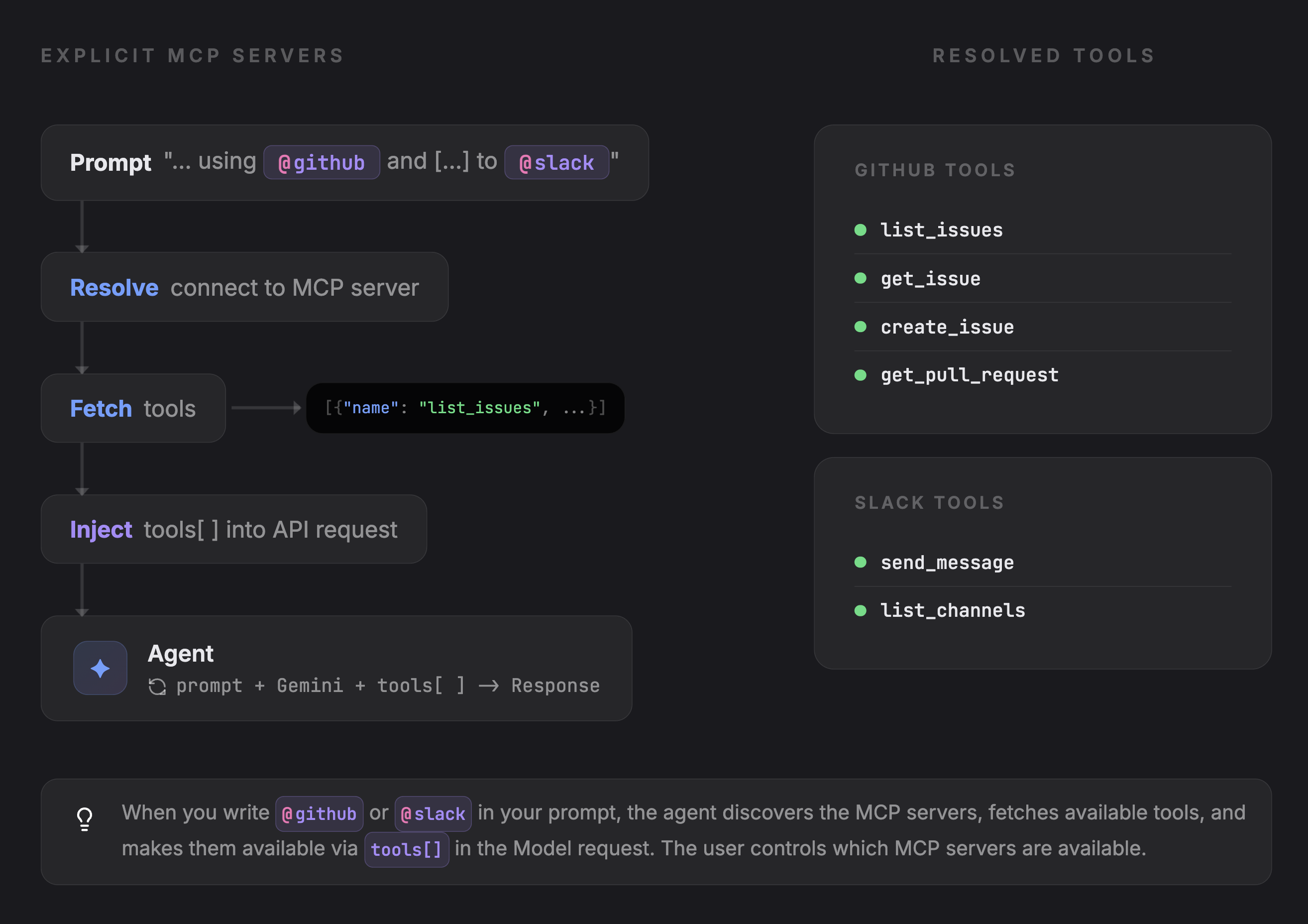 MCP servers stay opt-in. Servers are referenced in your prompt with an @mention, and the agent resolves, fetches, and injects the tools before the model request.
