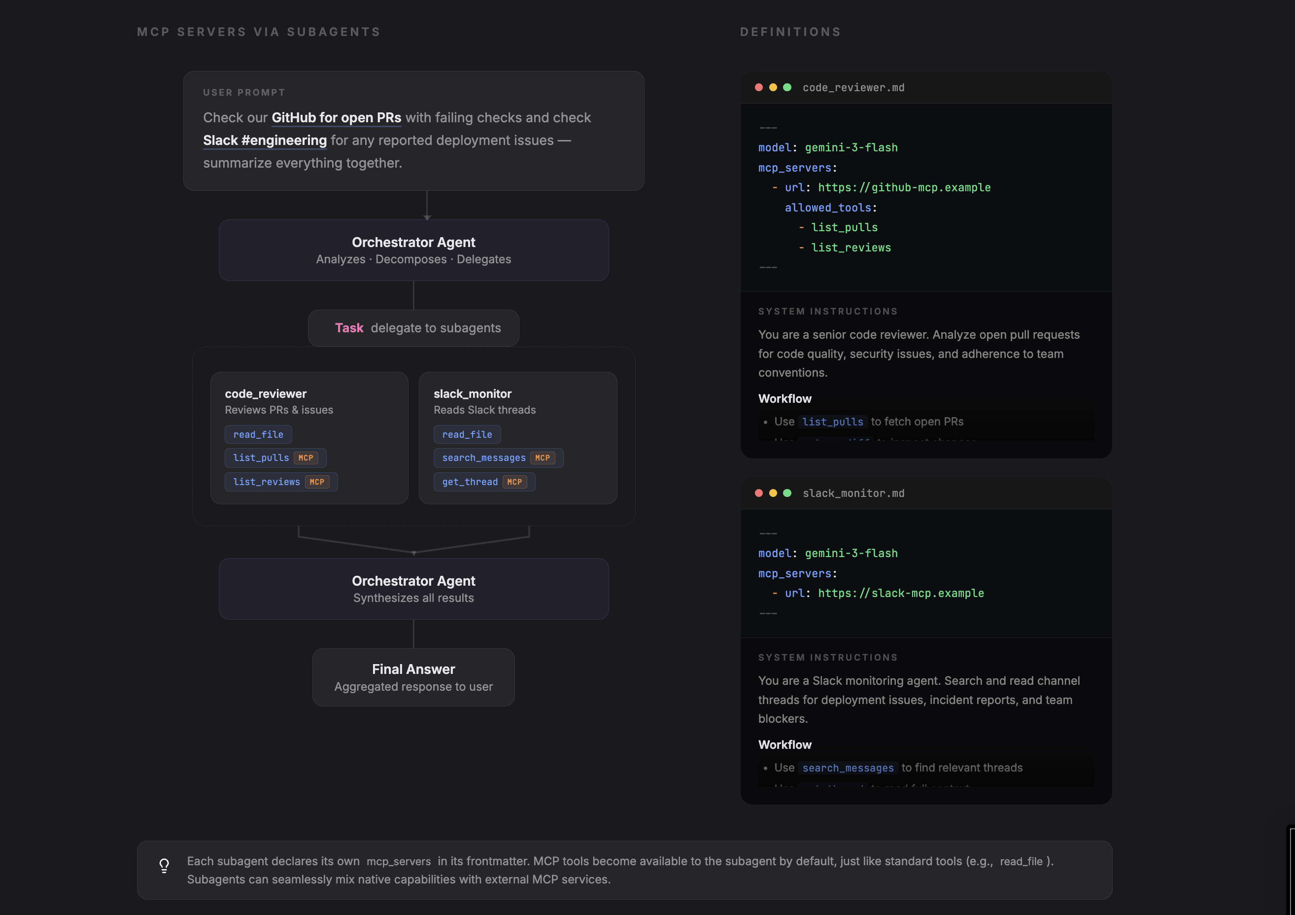 You are a code reviewer. Review open PRs...The main agent registers subagents. When invoked, each subagent connects to its declared MCP servers and merges those tools with native ones.